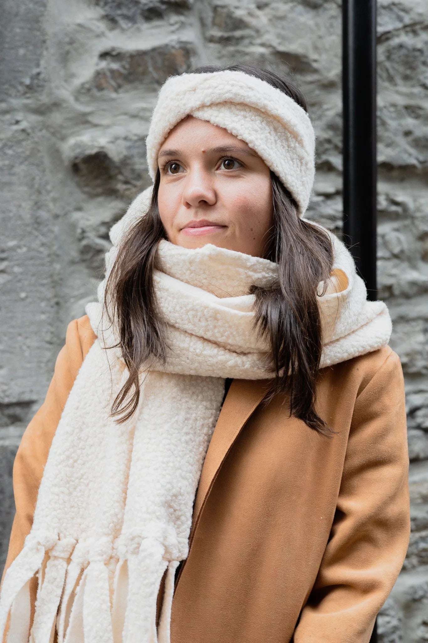 Ce bandeau automne-hiver est conçu dans une matière riche et texturée. Il est croisé à l'avant grâce à une couture.