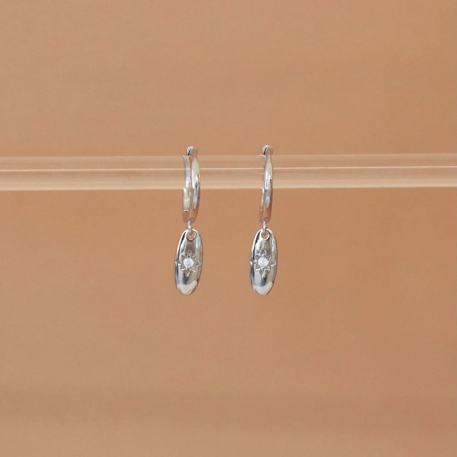 Boucles d'oreilles de type dormeuses confortable pour tous les jours. Retrouvez un pendentif de forme ovale avec un petit zircon et gravures.