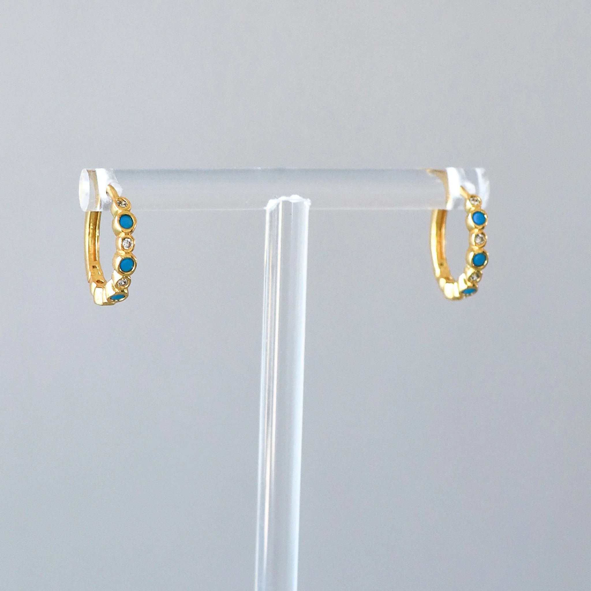 Boucles d'oreilles anneaux de type dormeuses avec zircons transparents et turquoises.