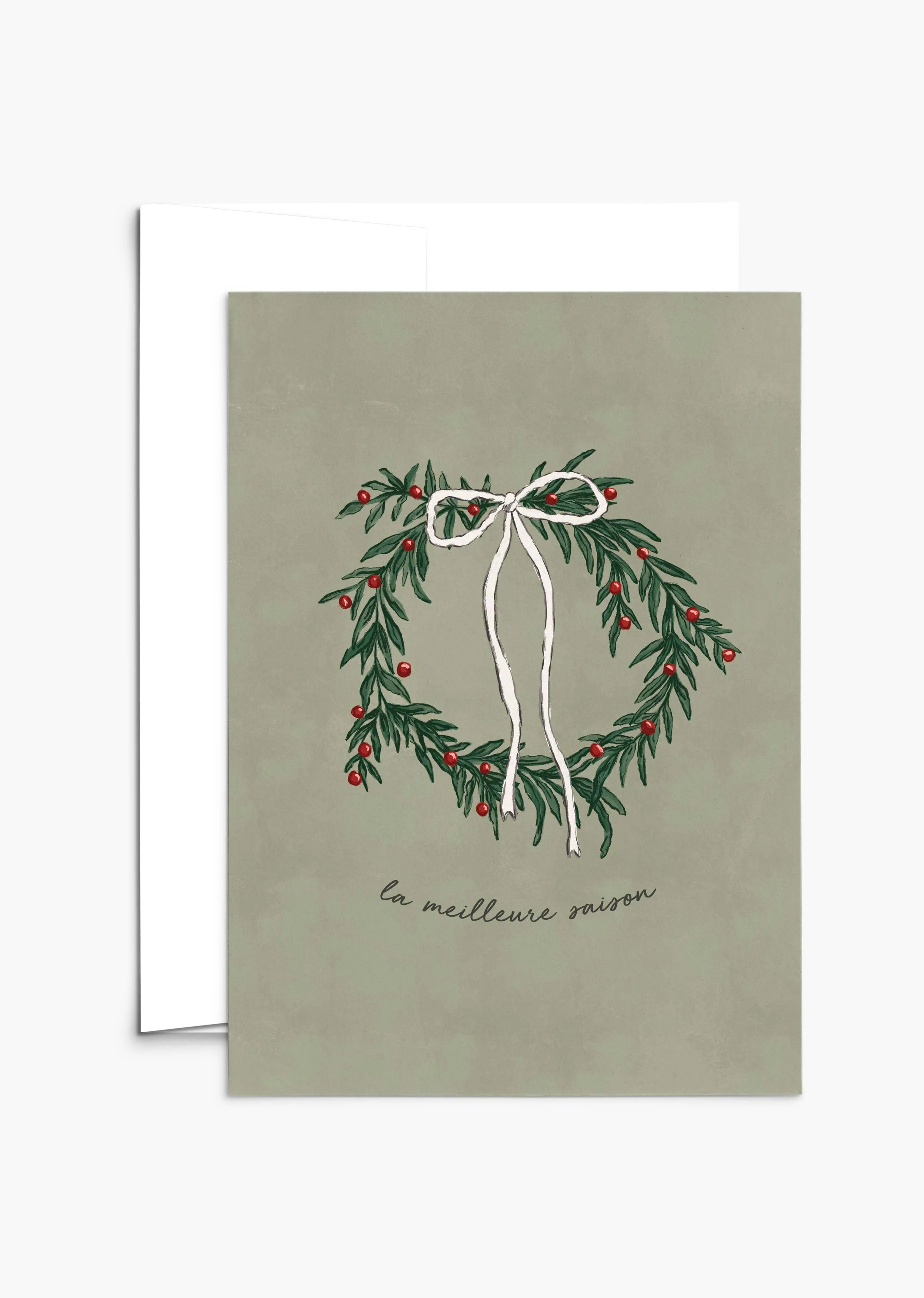 Célèbre la plus belle période de l’année avec notre carte de Noël La Meilleure Saison. Ornée d’une couronne délicate, nouée d’un ruban blanc et parsemée de petites baies rouges, cette illustration évoque toute la douceur et la magie du temps des Fêtes.