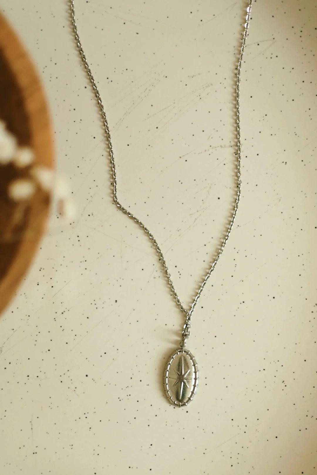 La magnifique chaîne Lunaire, avec son médaillon ovale et son étoile inspirante en relief, s'agencera parfaitement à ton style du jour.