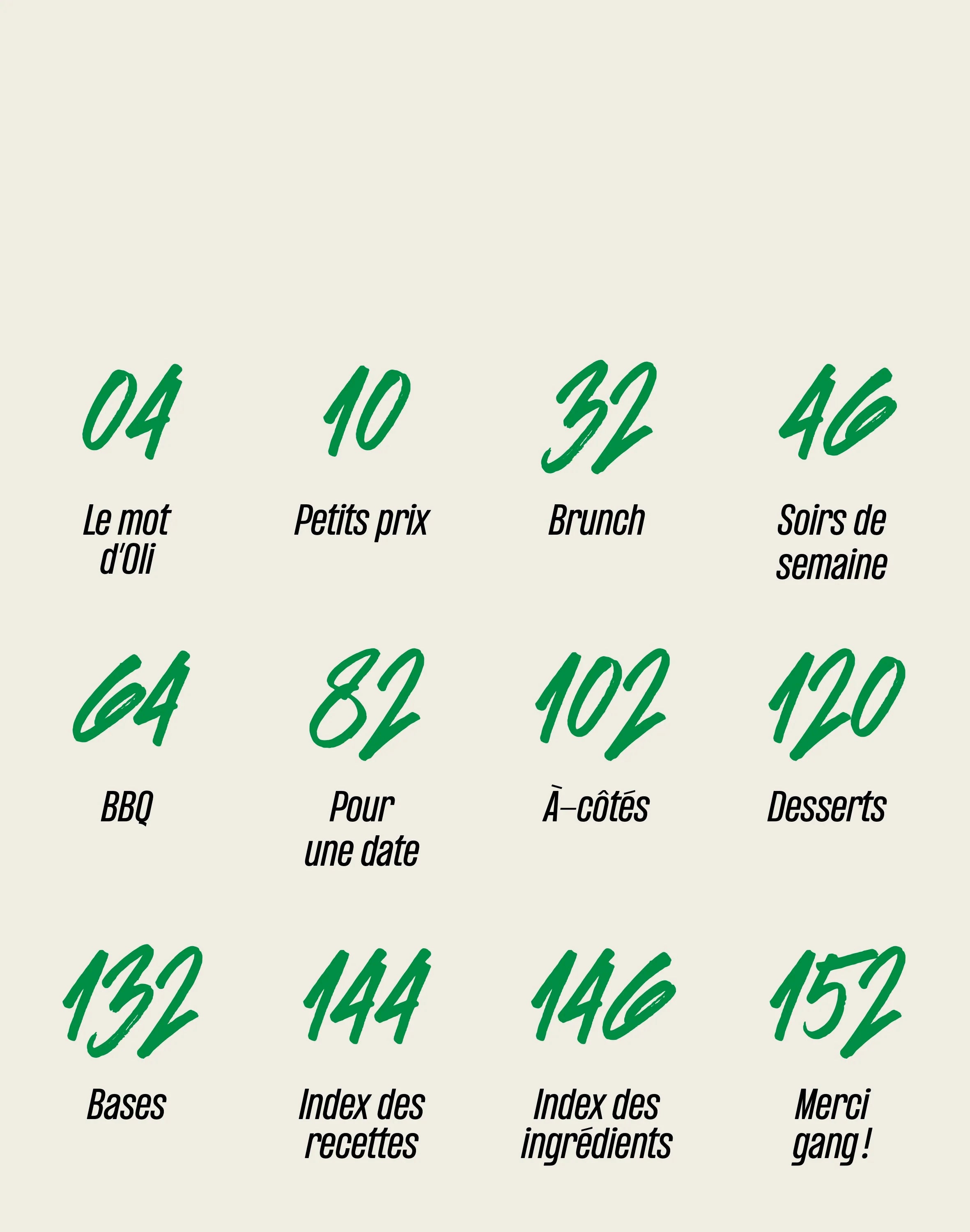 Unique en son genre, cet ouvrage s'adresse à celles et ceux qui font leurs premiers pas en cuisine ou qui souhaitent se régaler sans se casser la tête. Poulet à la Jerk, crème brûlée à l'orange, gaufres au chocolat noir, burgers sur pains de plantain ou carpaccio d'avocats, Oli propose des plats pour toutes les occasions : brunch, date ou soir de semaine.