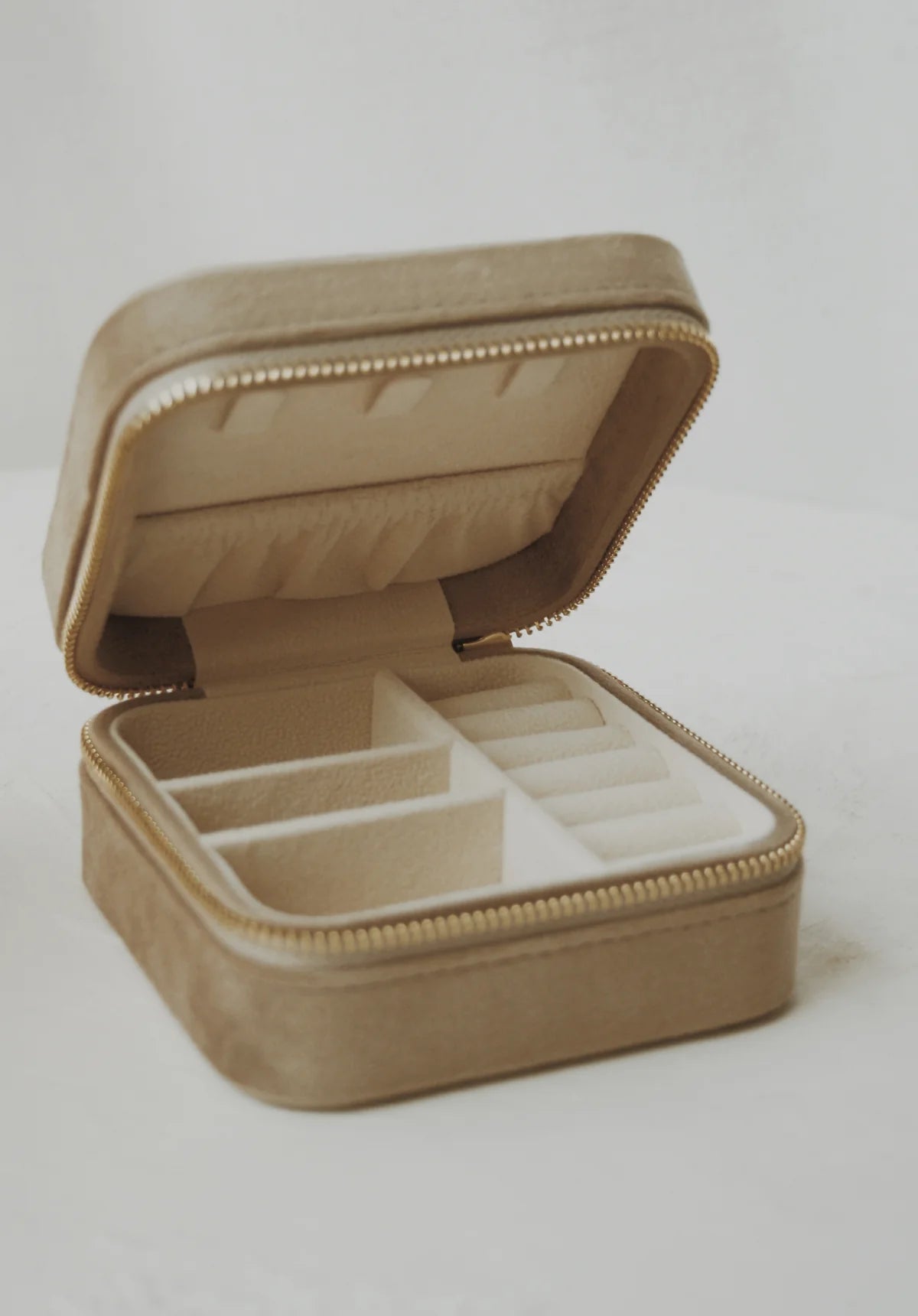 Boîte à bijoux carrée avec doublure intérieure en velours et extérieur en velours.