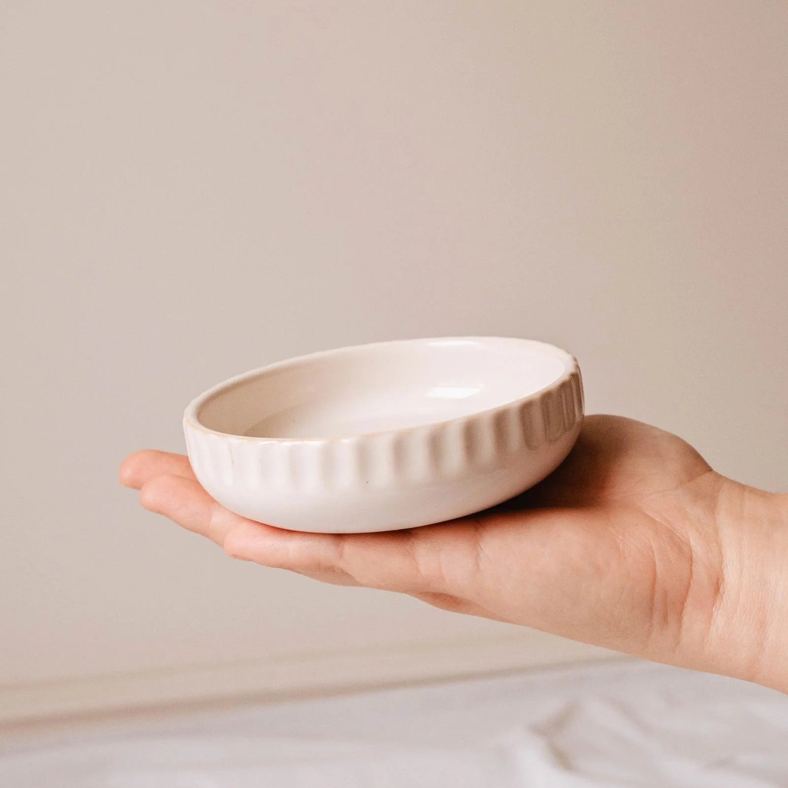 Add a touch of charm and elegance to your space with this beautifully handcrafted ceramic plate. It's the perfect companion to our Mimi & August candle refills, transforming every moment into a cozy experience. The minimalist, textured design not only looks great with your candles, but also doubles as a tray for your favorite bar soaps, jewelry, or other small treasures.
