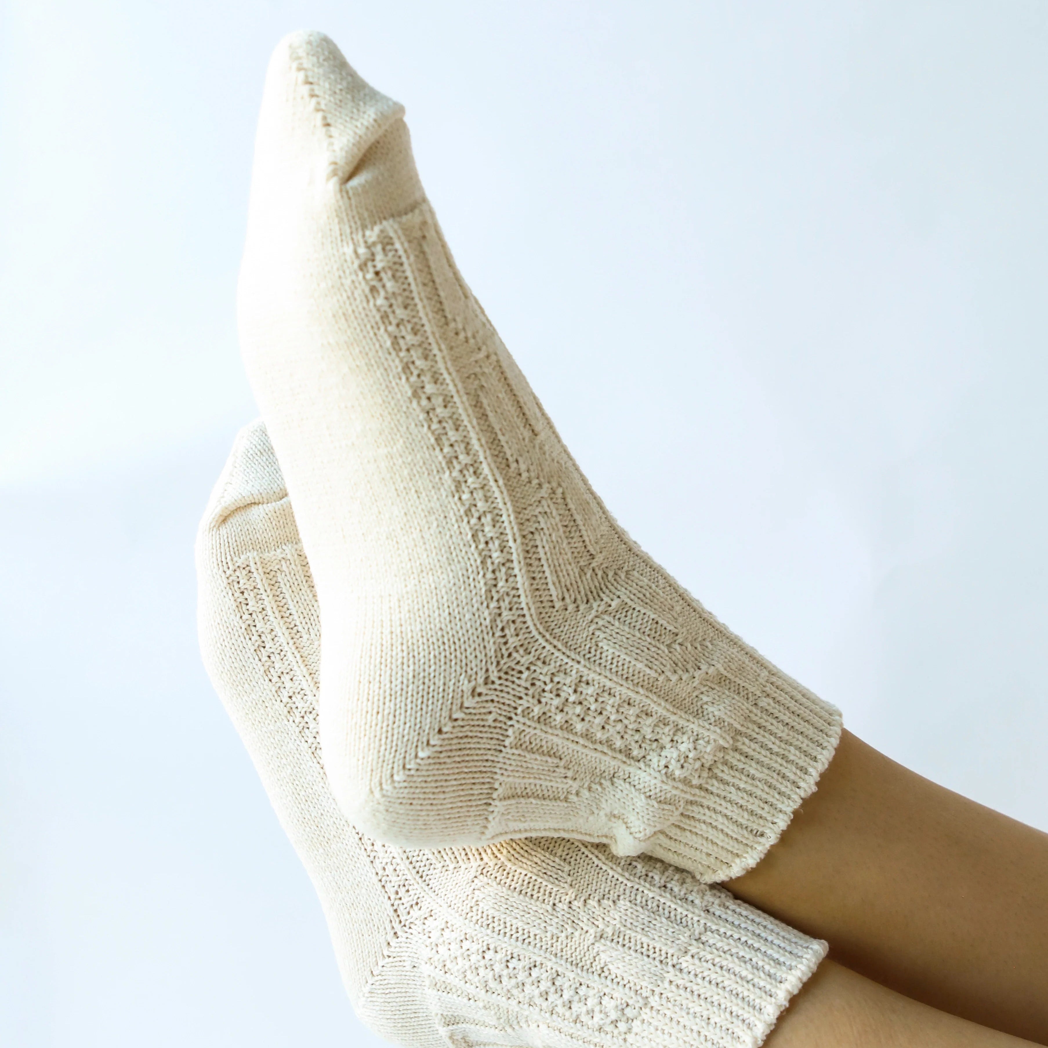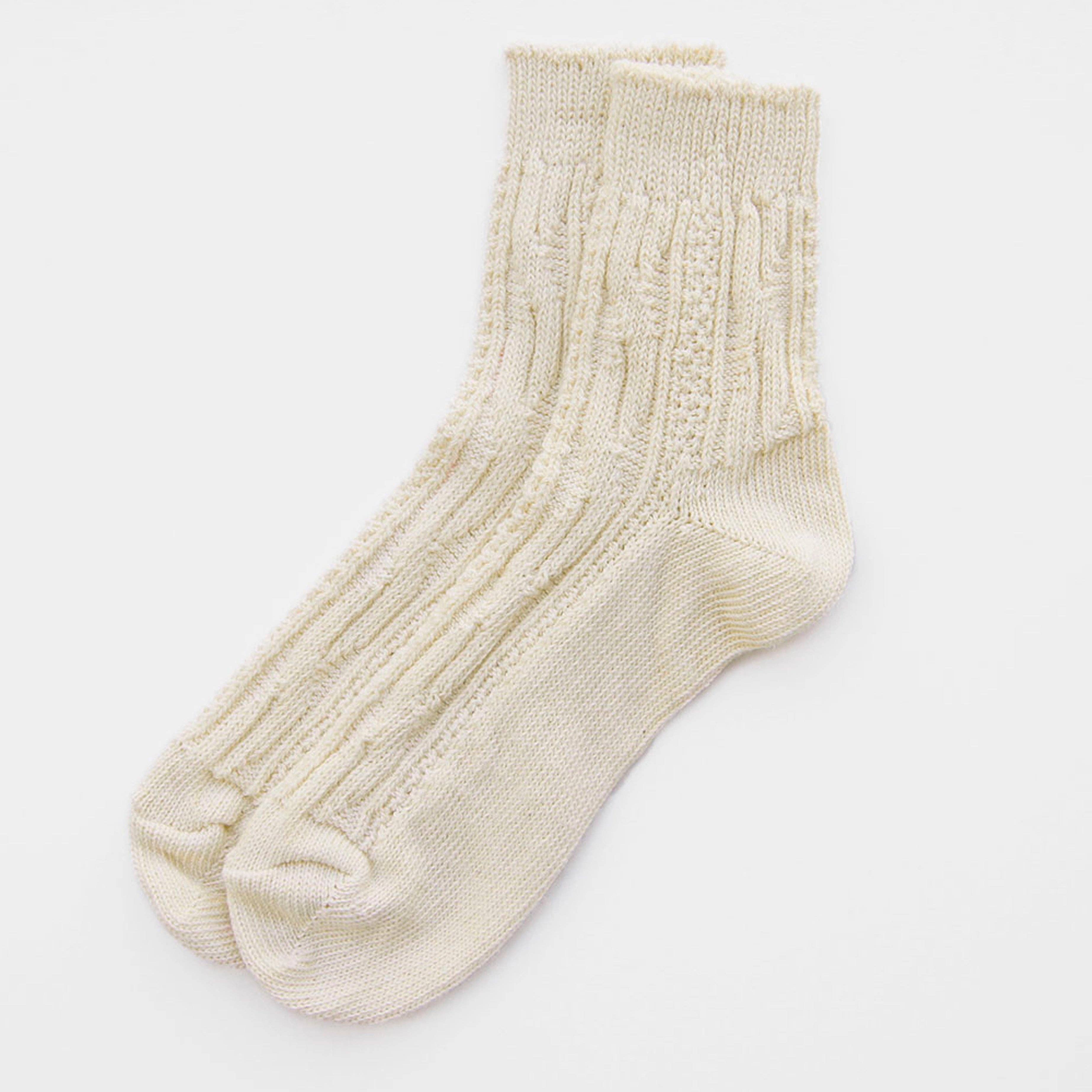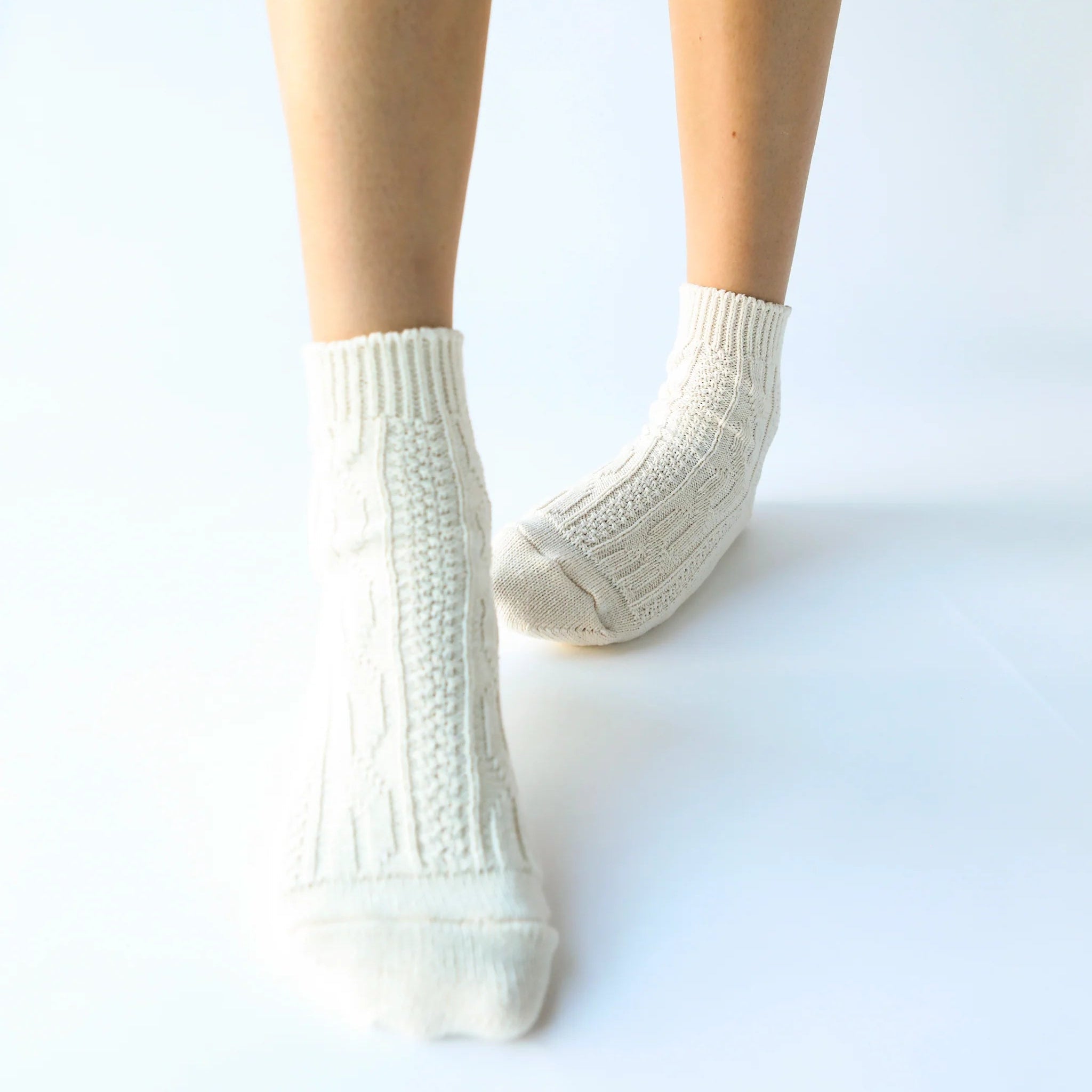 Cotton Jenny socks feature a pronounced cable knit texture and a retro appeal. The ankle length is the perfect height for the transitional seasons. Okayok socks are knitted on low-tech machines that are over 50 years old, contributing to their vintage quality and timeless aesthetic.