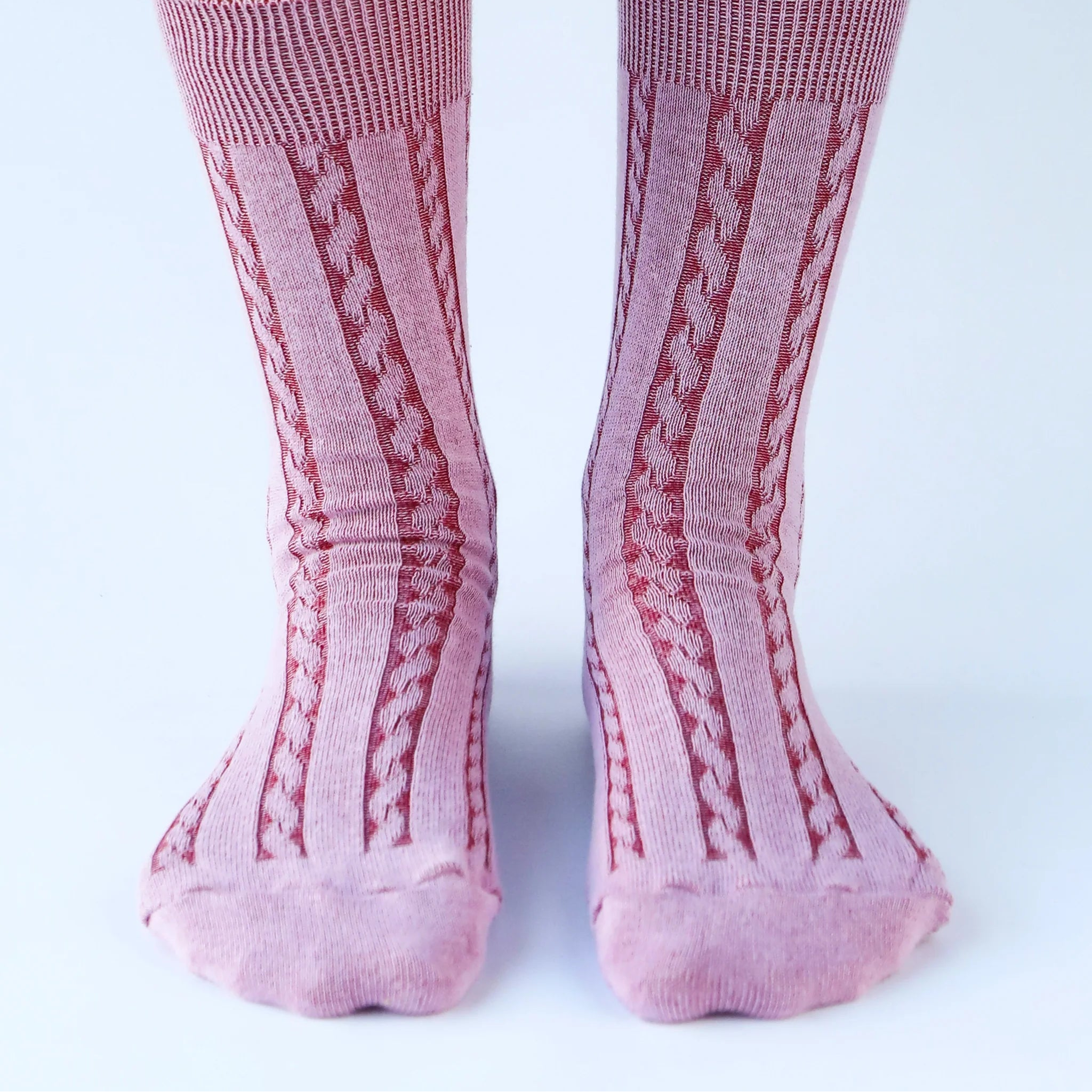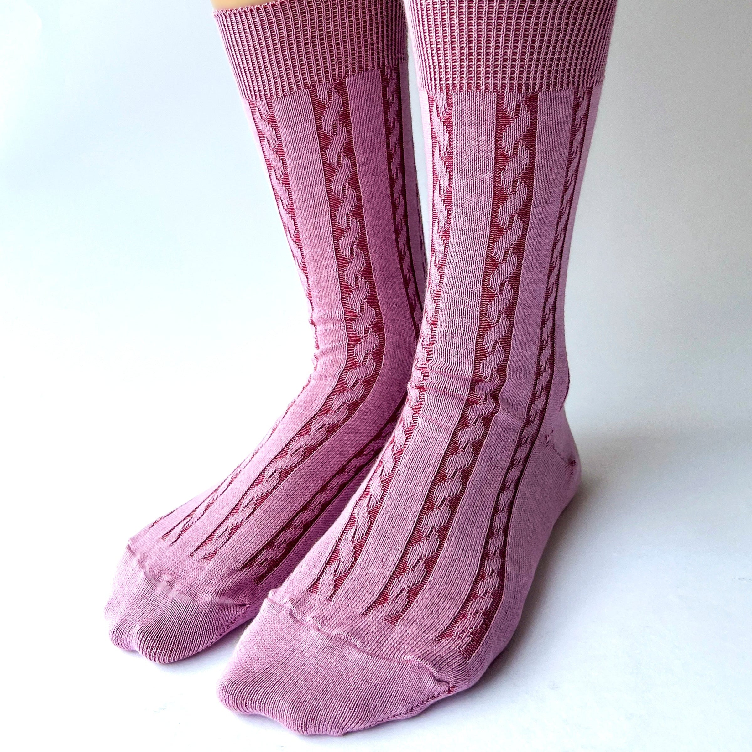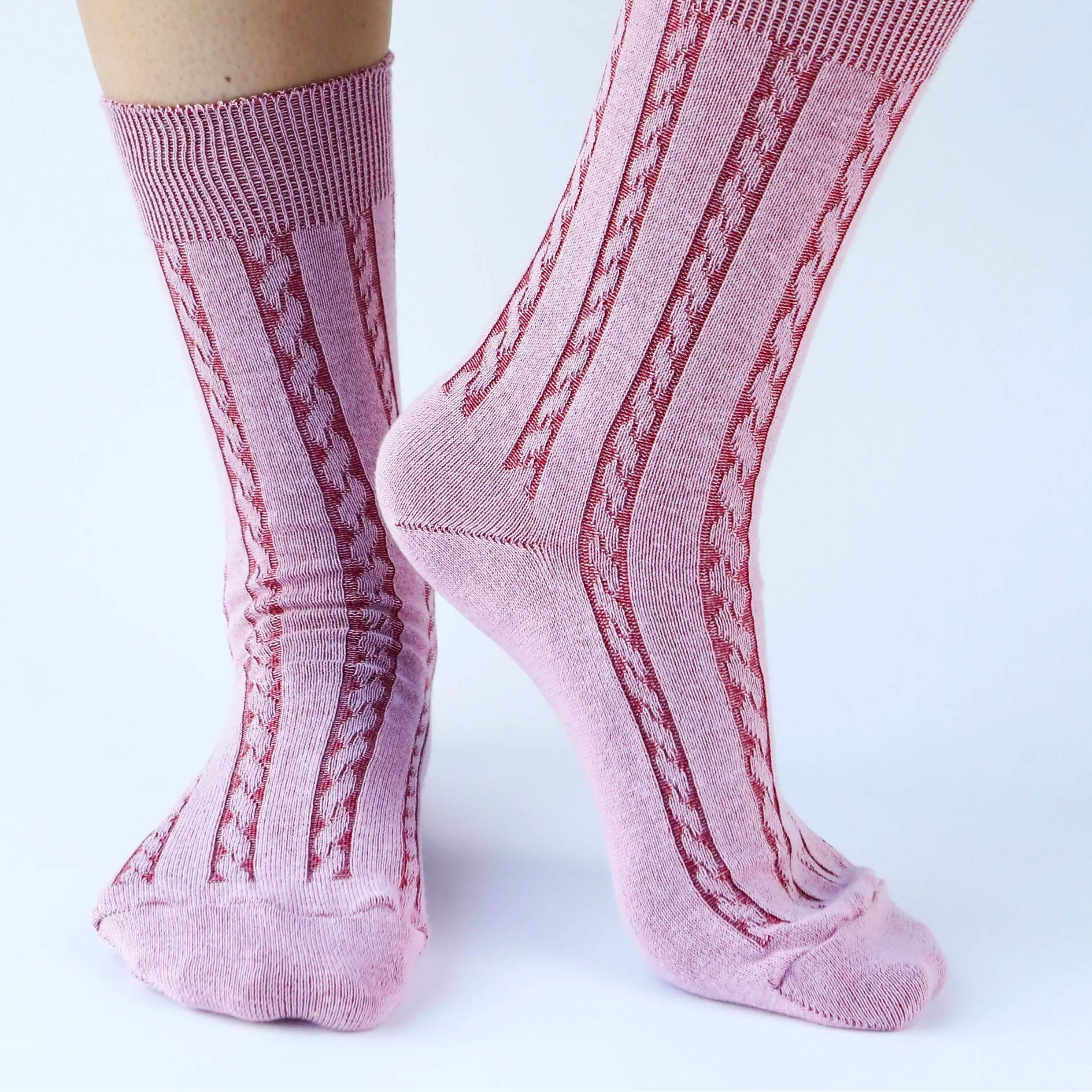 Dress socks in a cable knit make a subtle entrance, whether for dressing up for work or making a statement. Made in neutral and unexpected colors, the socks are knitted with contrasting yarns to enhance their cable-knit texture.