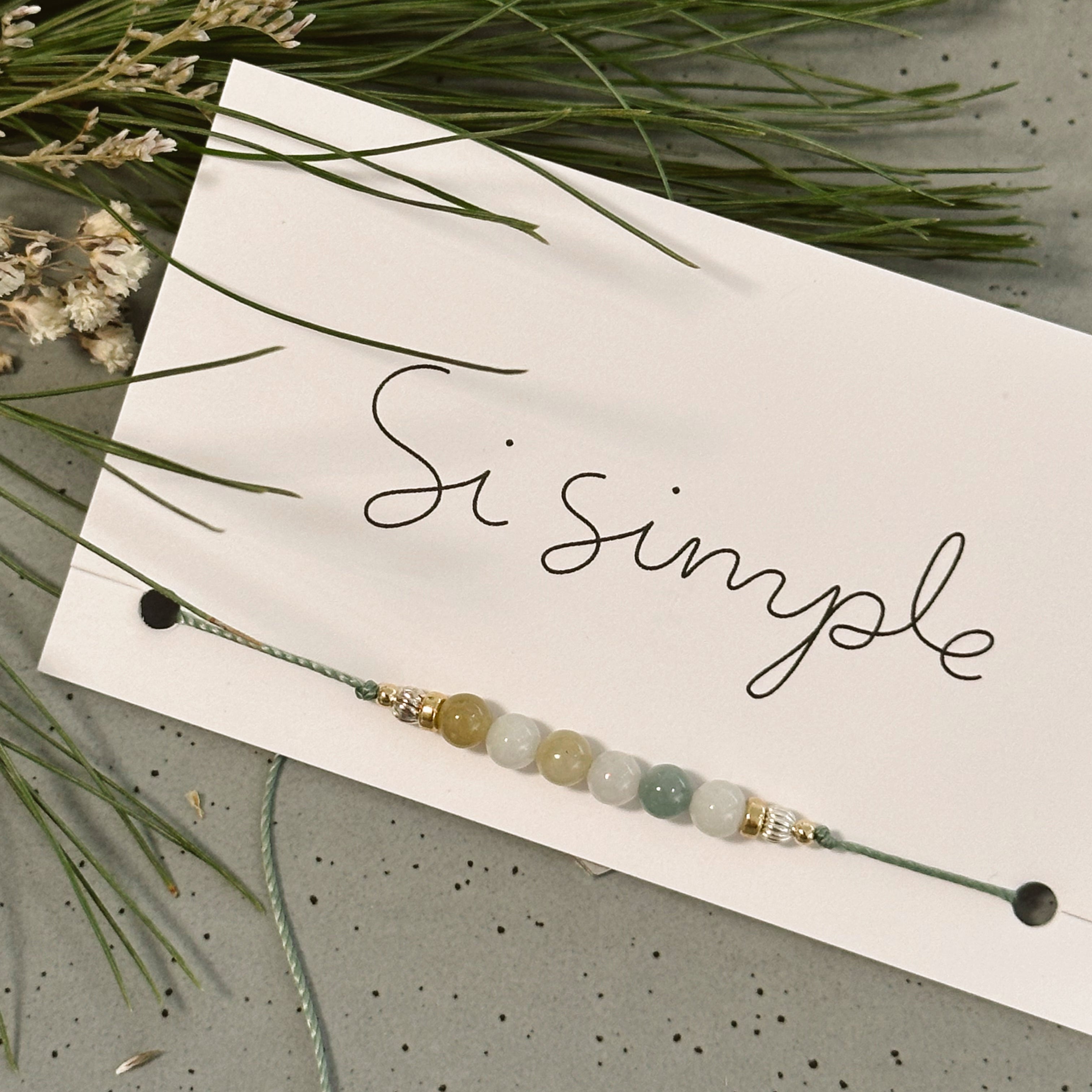Couleur douce et naturelle : un fil nylon vert sauge apaisant, rehaussé de perles en pierres semi-précieuses et de petites touches de métal doré et argenté, un mélange raffiné qui évoque sérénité et équilibre.