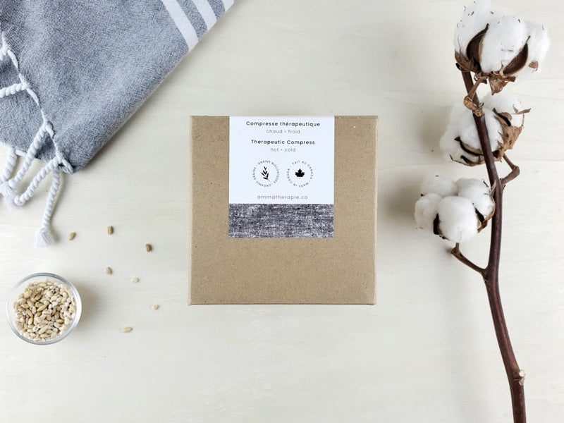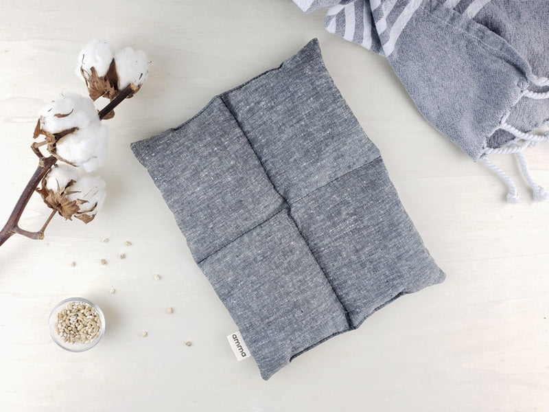 La compresse thérapeutique carrée de Amma Thérapie est ergonomique, pratique et facile d’utilisation avec ses 4 sections qui maintiennent les grains en place.